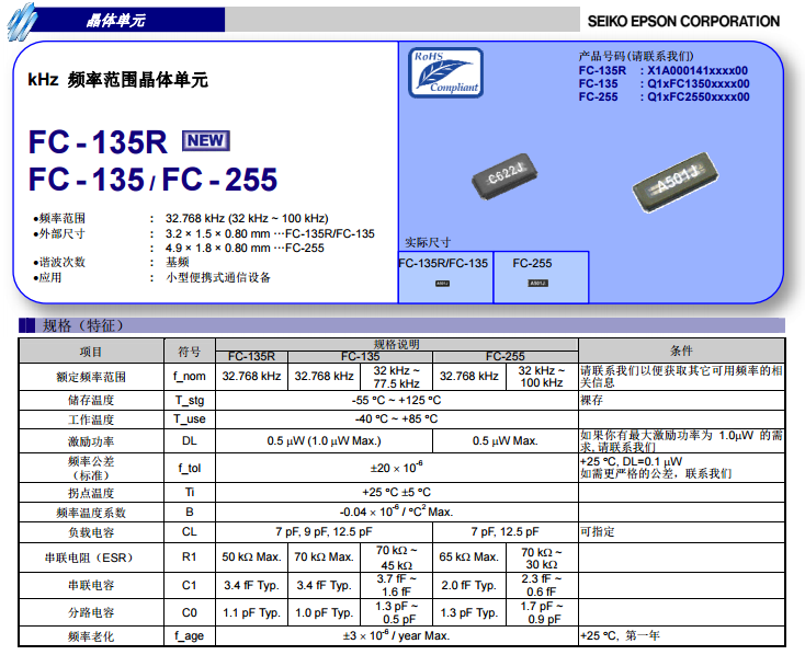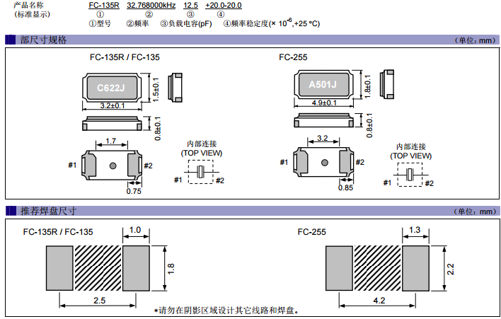 今天給大家來說說愛普生32.768khz貼片晶振中的一款老型號:FC-255。FC-255晶振應(yīng)用范圍很廣闊,比如多種電子消費(fèi)類,手機(jī)應(yīng)用,藍(lán)牙多功能播放器,無線通訊產(chǎn)品,平板電腦等多個(gè)領(lǐng)域,FC-255因32.768KHZ晶體本身外觀款式多元化,所以適合多個(gè)產(chǎn)品應(yīng)用.并且滿足歐盟ROHS環(huán)保要求,晶體本身有重量輕,體積小,超薄型等多種優(yōu)勢,得到市場認(rèn)可。FC-255頻率范圍32kHz~100kHz,精度10PPM或20PPM或者指定,常用負(fù)載電容7PF,12.5PF,尺寸:4.9X1.8mm,FC-255可用于時(shí)鐘模塊,智能手機(jī),全球定位系統(tǒng),因產(chǎn)品本身體積小,SMD編帶型,FC-255可應(yīng)用于高性能自動(dòng)貼片焊接,FC-255外觀尺寸具有薄型表面貼片型石英晶體諧振器,特別適用于有小型化要求的市場領(lǐng)域,比如智能手機(jī),無線藍(lán)牙,平板電腦等電子數(shù)碼產(chǎn)品。當(dāng)然FC-255逐漸被尺寸更小的FC-135替代是不爭的事實(shí),下面南山電子就給大家分享下FC-255的規(guī)格書,以供大家選型參考:
