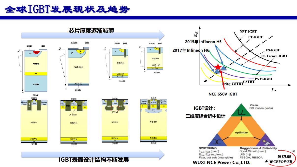 由上文可以看出,IGBT模塊需求很大,要問國產(chǎn)IGBT品牌有哪些?首先來說說國外IGBT品牌:以前,市場主要被英飛凌、三菱、富士電機為首的等品牌占領(lǐng),要想抓住新時期功率半導(dǎo)體行業(yè)機會,國產(chǎn)廠商亟待突破高端技術(shù)。但是在經(jīng)過貿(mào)易戰(zhàn)的洗禮后,越來越多的中下游廠商主動開始嘗試接受國產(chǎn)IGBT,這就給了國產(chǎn)IGBT模塊更多的試錯機會,從而促進了國產(chǎn)IGBT的技術(shù)迭代,讓國產(chǎn)IGBT進入了一個良性的迭代循環(huán)的過程。近期,IGBT的國產(chǎn)替代已經(jīng)進入了高速增長期,越來越多的中小型客戶已經(jīng)完成了高比例的國產(chǎn)化,在工業(yè)領(lǐng)域以及部分細分領(lǐng)域,國產(chǎn)化率已經(jīng)達到50%以上。國產(chǎn)IGBT品牌有比如說斯達半導(dǎo),株洲中車,深圳比亞迪,無錫新潔能,杭州士蘭微,吉林華微等。其實比較起來很難說國產(chǎn)IGBT模塊品牌哪個好?這個問題是見仁見智的,就算我們南山電子授權(quán)經(jīng)銷新潔能IGBT,我也只能說新潔能是一家專注于功率器件研發(fā)和生產(chǎn)的公司,新潔能IGBT基于溝槽電場截止型IGBT技術(shù)(Trench Field Stop)理論,進一步優(yōu)化了器件結(jié)構(gòu),采用了先進超薄片工藝制程(Ultra Thin Wafer Process),大幅提高了器件的功率密度,顯著改善了動態(tài)、靜態(tài)性能。相比上一代新潔能IGBT,新一代(Trench FS II)新潔能IGBT模塊面積更小,芯片厚度更??;導(dǎo)通壓降(VCEsat)降低約0.3V,開關(guān)損耗降低20%以上;器件可耐工作溫度更高,使用壽命更長;且維持了較強的短路能力、較高的參數(shù)一致性。