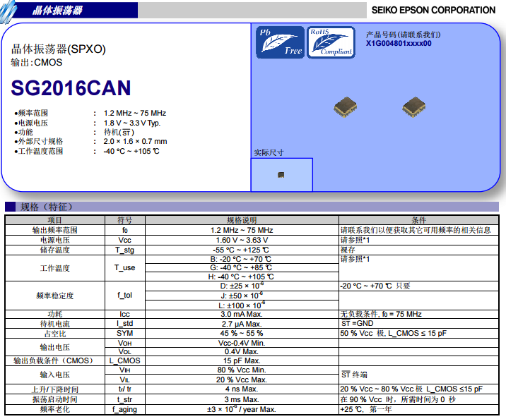 EPSON公司推出的5G晶振SG2016CAN,是一款CMOS輸出的晶體振蕩器。頻率穩(wěn)定度可達(dá)±50PPM,頻率老化度僅為±3PPM/year,具有較高的穩(wěn)定性,滿足光模塊長(zhǎng)期使用的要求。SG2016CAN封裝小,尺寸為2.0mm×1.6mm×0.7mm,光模塊體積小,采用2016封裝,更容易PCB設(shè)計(jì)。SG2016CAN的工作溫度范圍:-40℃~105℃,具有較高的工作溫度。5G前傳光模塊中,一般需要選擇寬溫的工作期間,所以5G晶振也需要更高的溫度范圍,使用SG2016CAN可以滿足光模塊高溫的需求。下面南山電子就給大家看下5G晶振SG2016CAN的規(guī)格書(shū),以供大家選型參考: