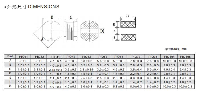 風(fēng)華高科PIO貼片功率電感,一直備受市場好評,主要原因是PIO功率電感可以完全替換國內(nèi)市場上常用的CD系列功率電感,其實說替換也不對,因為兩者規(guī)格尺寸相同,而PIO功率電感也是國內(nèi)產(chǎn)品,CD系列功率電感在國內(nèi)應(yīng)用非常廣泛,主要因為其高品質(zhì)高Q值,耐大電流。非屏蔽鐵氧體磁芯構(gòu)造,成本較低。產(chǎn)品無鉛等特點,而PIO功率電感其實也就是CD系列功率電感,但是畢竟出自風(fēng)華高科PIO貼片功率電感相比于外面的CD功率電感,至少質(zhì)量上售后上都有保證的,PIO功率電感常用尺寸一般就是PIO54,PIO43,PIO75等,其實PIO功率電感和CD系列一樣:比如PIO54等同于CD54,就是直徑X高度,例如5表示直徑為5mm,4表示高度為4mm。老規(guī)矩,南山半導(dǎo)體繼續(xù)為大家分享PIO功率電感的規(guī)格書,方便大家了解規(guī)格,選型參考: