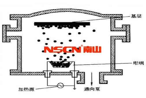 在真空狀態(tài)下,加熱蒸發(fā)容器中的靶材,使其原子或分子逸出,沉積在目標(biāo)物體表面,形成固態(tài)薄膜。依蒸鍍材料、基板的種類可分為:抵抗加熱、電子束、高周波誘導(dǎo)、雷射等加熱方式。蒸鍍材料有鋁、亞鉛、金、銀、白金、鎳等金屬材料與可產(chǎn)生光學(xué)特性薄膜的材料,主要有使用SiO2、TiO2、ZrO2、MgF2等氧化物與氟化物。蒸鍍除金屬外,樹脂與玻璃也可以使用、近年來連紙也變成可蒸鍍。如圖1。